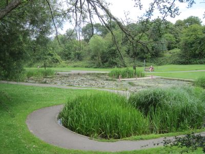The space contains a kidney-shaped pond surrounded by water lilies and rushes, plus grassy areas interspersed with mature trees and woodland patches.