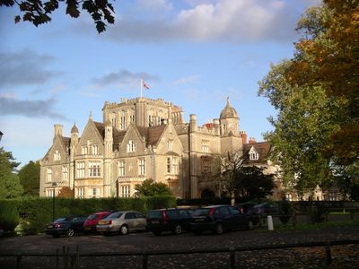 The Victorian Tudor-style mansion features ornate stone carvings, mullioned windows, and defensive towers spread across multiple wings of the structure.