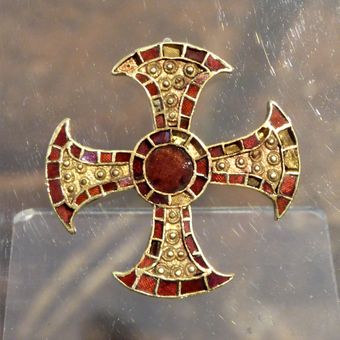 Found in 2011, this grave revealed a gold and garnet cross, iron knife, and glass beads, indicating the burial of a high-status individual from Anglo-Saxon society.