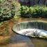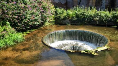The Tumbling Weir features a circular design where water enters through an opening at the top and flows down through concentric rings.