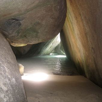 The Baths is a stretch of coastline on Virgin Gorda with large granite blocks forming caves and natural pools. The rocks sit directly on the beach and create shaded passages between the open sea and calm water spots.