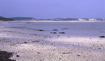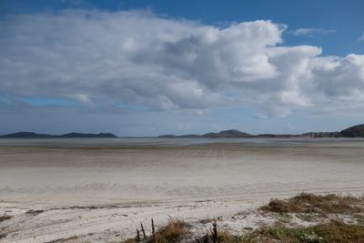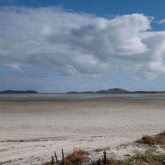 The white shell sand beach stretches between Ardmhor and Eoligarry villages on the northern tip of Barra, facing the waters of the North Atlantic Ocean.