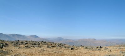 The summit contains outcrops of Seathwaite Fell Formation, displaying distinct layers of volcaniclastic sandstone, tuff, and conglomerate formations.