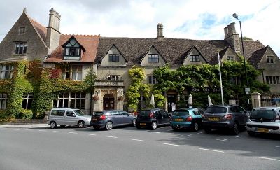 The Old Bell Hotel and Restaurant is a stone building next to Malmesbury Abbey with 34 rooms decorated using antiques and stained glass windows. The spaces blend historical details with modern amenities for guests.