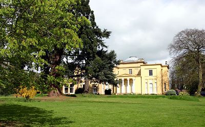 Upton Hall is a Greek Revival country house in Upton featuring a symmetrical southern facade dominated by a portico with Ionic columns and a central dome. The estate comprises more than 70 rooms spread across 10 acres of grounds with gardens and outbuildings.