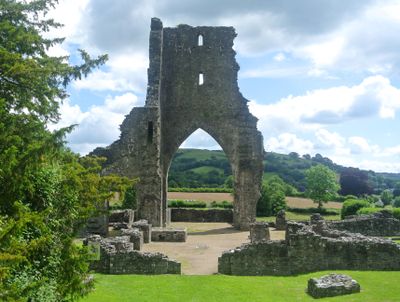 The stone ruins of Talley Abbey include four bays of the nave, a south aisle, and a tower among steep wooded hills in Carmarthenshire.