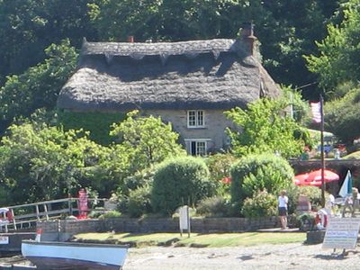 The two-story cottage features walls of slatestone rubble, a thatched wheat reed roof, and a distinctive L-shaped structure near the River Fal.