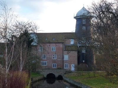 The watermill construction dates to 1737, while the adjacent tower mill was added in 1814 with an inscription marking Napoleon's exile to Elba.