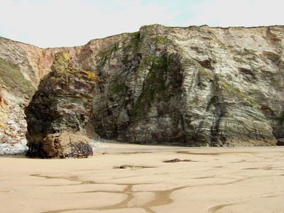Watergate Beach extends for two miles along the Atlantic coast of north Cornwall, featuring golden sand and clear waters suitable for swimming.