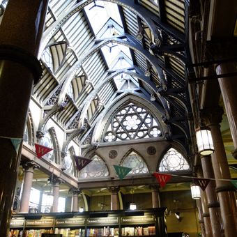 The Wool Exchange is a Victorian trading hall featuring tall granite columns, intricate wrought ironwork, and an elaborate hammer-beam roof. The building's interior and exterior showcase the craftsmanship invested in creating a grand center for international wool commerce.