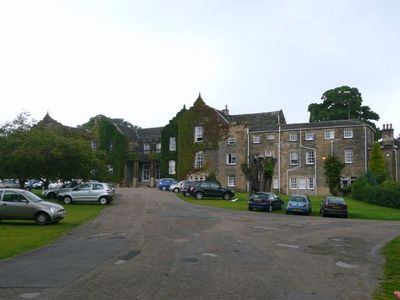 The sandstone H-shaped building features a slate roof, distinct wings, and balconies overlooking the entrance, with elaborate interior design elements throughout its halls.