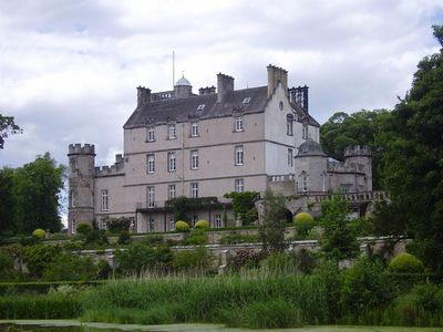 The castle features traditional Scottish Renaissance architecture with connected reception rooms, detailed plasterwork ceilings, and carved wood decorations throughout the interior.