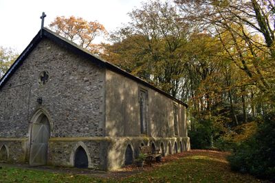 The stone chapel contains a rectangular plan with limestone details, slate roof, and traditional architectural elements from the early 19th century period.