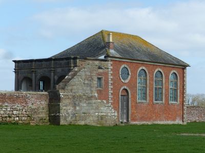 The chapel connects to former hall buildings through a five-foot elevated causeway, with separate entrances for family members and tenants.