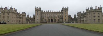 Floors Castle occupies a position on the banks of River Tweed, displaying architectural features with turrets and battlements across its grand Georgian structure.