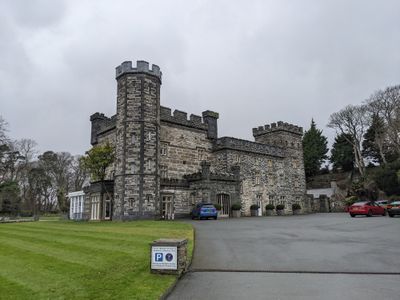 Castell Deudraeth is a mid-sized country house with castle-like features built from local slate and includes a three-storey central block with taller adjoining sections. The building now operates as a hotel, combining its historic structure with contemporary guest accommodations.