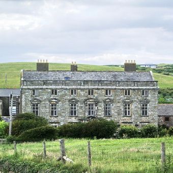Moresby Hall stands on elevated grounds adjacent to St Bridget's Church, featuring architectural elements from different periods including a stone spiral staircase.