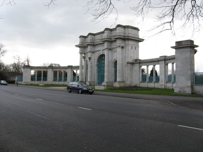 A Portland stone triumphal arch with three openings stands 14 meters high and 18 meters wide, featuring Doric columns and wrought iron gates.