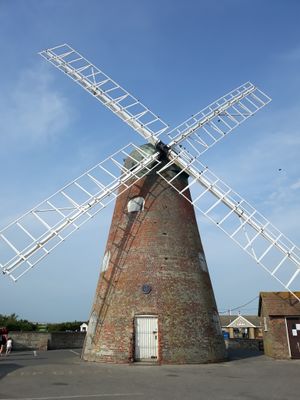 The brick tower mill rises four stories high with a domed cap and restored sails that turn according to wind direction.