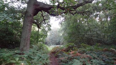 Oxhey Woods encompasses 98 hectares of natural woodland with numerous pathways winding through dense vegetation and ancient trees spread across the landscape.