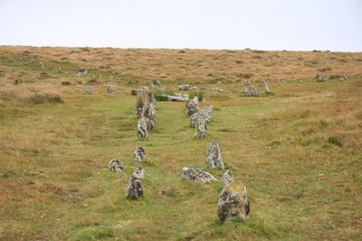 The stone alignment at Shovel Down forms part of a larger complex of prehistoric monuments, including burial mounds that indicate ancient community practices.