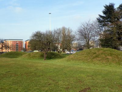 The Six Hills archaeological site contains multiple earthworks and ancient burial mounds positioned near the former Roman Fosse Way in Leicestershire.