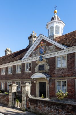 The College of Matrons stands within Salisbury Cathedral Close with its lead domed roof lantern and Stuart period Royal Coat of Arms on display.