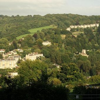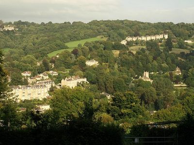 The Crowe Hall estate contains three hectares of landscaped gardens extending down a hillside, offering views across the valley to Prior Park and Bath.