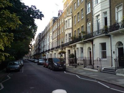 The ground floor and basement flat at 34 Montagu Square features high ceilings, pale paintwork, stucco details, and cast iron balconies.
