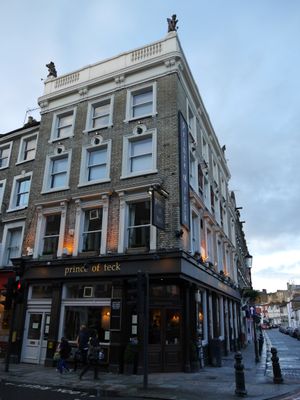 The Prince of Teck occupies a corner building at 161 Earls Court Road, featuring stone wyverns and decorative busts on its Victorian facade.