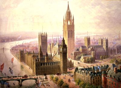 The Imperial Monumental Halls and Tower was designed as a massive Gothic structure reaching 167 meters high, adjacent to Westminster Abbey in London.
