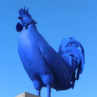 Hahn/Cock is a fiberglass sculpture in the City of Westminster, London, depicting a bright blue rooster standing 5 meters tall. The smooth surface gleams in daylight and the intense ultramarine blue contrasts sharply with the historic surroundings of the square.