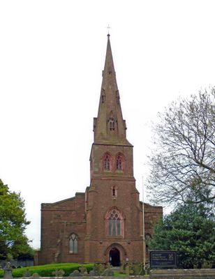 The Grade II listed St Oswald's Church features a red sandstone steeple with diagonal buttresses and decorative carved elements at its western end.