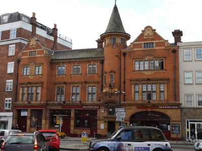 The King's Head occupies a corner position at 4 Fulham High Street with Scottish Baronial architectural elements and a distinctive garden space.