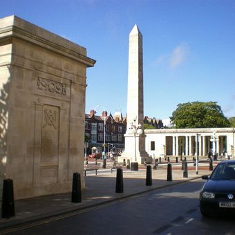 The Portland stone memorial features two colonnades with chapels at each end, surrounding a central obelisk in London Square Memorial Garden on Lord Street.
