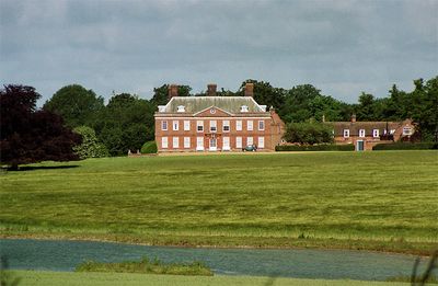 Hanworth Hall is a brick country house with a nine-bay eastern facade and traditional two-part floor plan from the late 17th century. The structure combines brick walls with stone detailing and features period sash windows and a stone-coped parapet.
