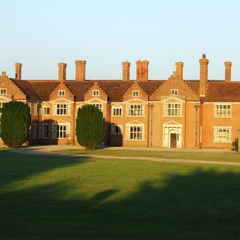 Ampton Hall features a Jacobean architectural style with red brick construction, plaintiled roofs, and two main stories plus attic spaces.
