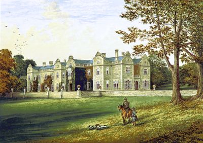 The limestone country house features a two-story range with three central bays, five Jacobethan-style bays on the left, and one bay on the right.