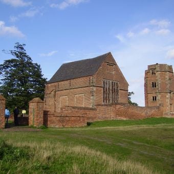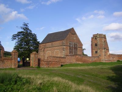The brick mansion structure stands among the grounds of Bradgate Park, displaying early Tudor architecture with tall chimneys and remaining stone walls.