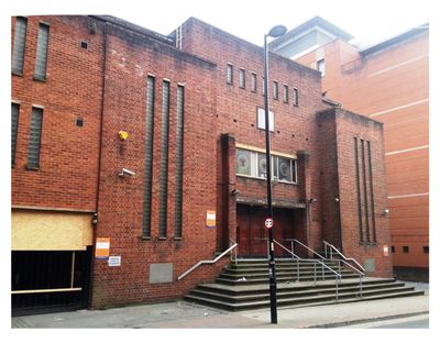 The former building's stained glass windows, designed by John Bradshaw, featured distinctive patterns and motifs representing Jewish symbolism.