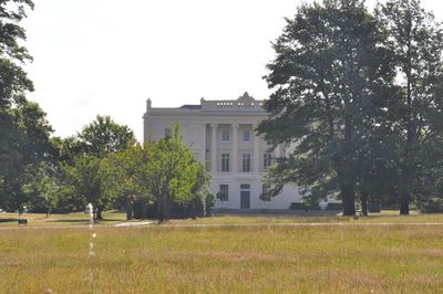 The interior contains a Grecian hall and an elaborate staircase from 1800, constructed of cast and wrought bronze with greyhound figures on alternate steps.