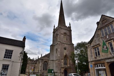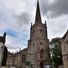 The Church of St Lawrence features a stone exterior with numerous architectural details, stained glass windows, and a tall bell tower reaching skyward.