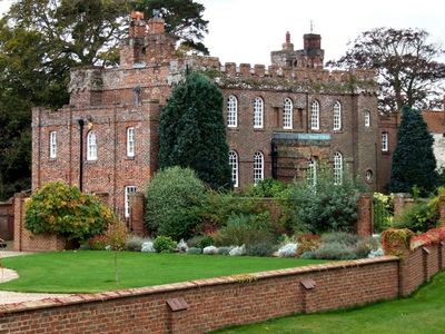 Somersby Grange is a two-storey red brick manor house distinguished by four square corner towers and a hipped slate roof. The building includes a basement level and features a two-storey extension on its east side that was added to expand the living spaces.