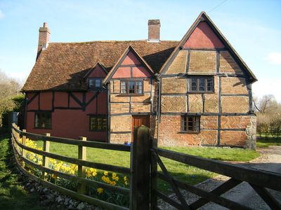 The medieval manor house combines architectural elements from different periods, featuring wooden beams, period fireplaces, and traditional Tudor design elements throughout its structure.