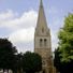 The late 13th-century west tower displays banded limestone and ironstone construction, topped with paired bell-chamber openings and a broach spire.