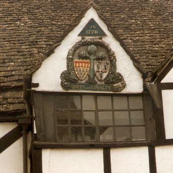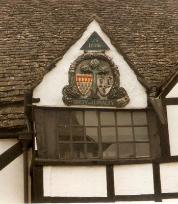 The Yelde Hall features an asymmetrical frontage with two bays, timber framing, and carved town arms visible on its left gable from 1776.
