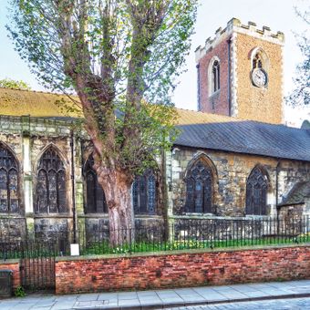 The Church of St Martin Cum Gregory features Gothic architectural elements with a west tower refaced in brick during the seventeenth century.