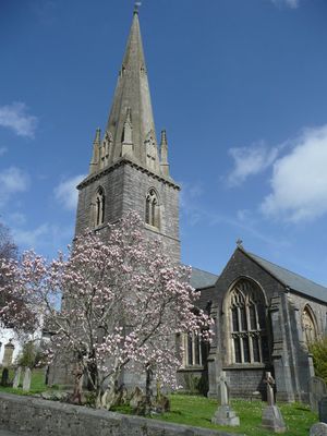 The Parish Church of St Mary features detailed stonework throughout its structure, with a prominent bell tower visible across the Uffculme landscape.