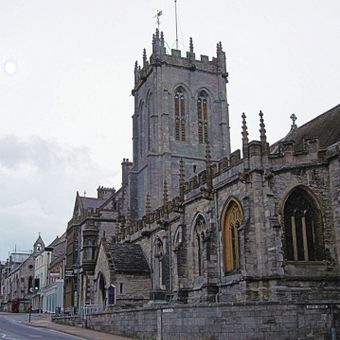 St Peter's Church features a 15th-century west tower rising above High Street shops, with walls constructed of Portland and Ham stone ashlar materials.