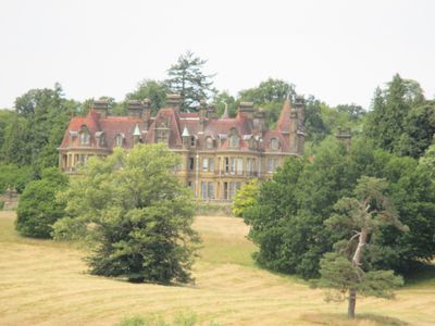 Wykehurst Place is a Gothic Revival mansion in Bolney featuring turrets, arches, and conical roofs modeled after Loire Valley chateaux. A long terrace extends from the building and overlooks the gardens that slope away behind it.
